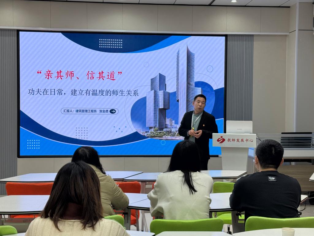 11月21日下午,由教师发展中心主办的“弘扬教育家精神系列活动(三)”在2教2102举办,建筑管理工程系产业副主任贺全德老师围绕《“亲其师、信其道”—功夫在日常,建立有温度的师生关系》为题进行分享交流。