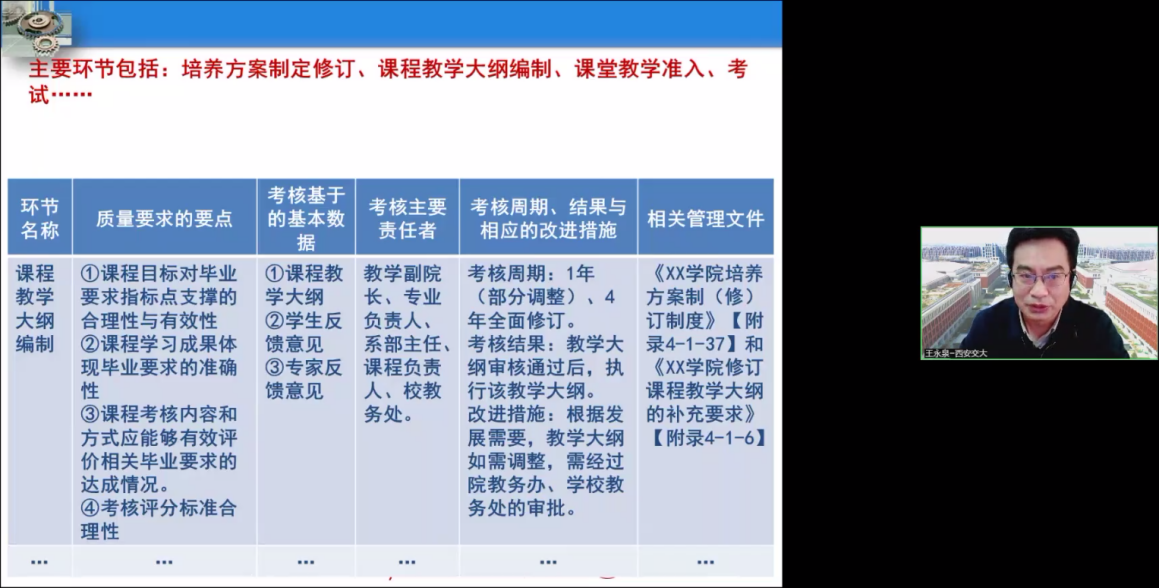 王教授从专业认证的标准内涵与底线要求、OBE课程建构的原则与要点、课程目标及其评价以及关于工程教育认证的问题及改进方向四方面做经验分享,阐述专业在工程教育专业认证工作中如何落实的三大理念,如何提高工程教育专业认证的自评自建工作质量。围绕OBE理念与面向产出的评价机制、专业和课程层面的产出定义、在课堂教学中落实产出和课堂教学产出评价等问题,结合西安交通大学机械工程专业课程建设实例,对OBE课程教学从设计到实施再到评价各环节所需遵循的一般原则、形式标准和操作要点做具体分析。