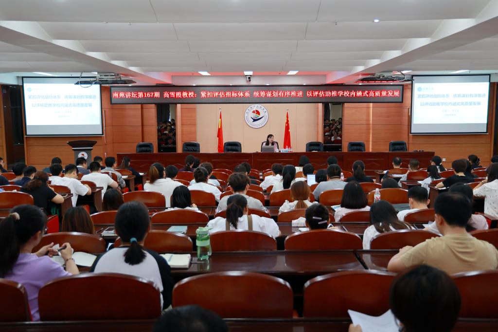 蒋春艳作总结发言,她指出,高雪霞教授的讲座内容丰富、针对性强,兼具理论深度和实践厚度,既顶天立地,又满怀深情厚义,对学校迎接本科教学工作合格评估提供了借鉴和指导。学校现已进入迎评备战的关键时期,希望与会人员认真学习领会讲座精神,深刻理解把握新一轮审核评估内涵要义,结合工作实际,做到以问题为导向,对标建设,把自评自建工作做实、做好,高质量完成审核评估各项工作目标任务,以高水平的评建成果推动学校事业发展迈上新台阶。