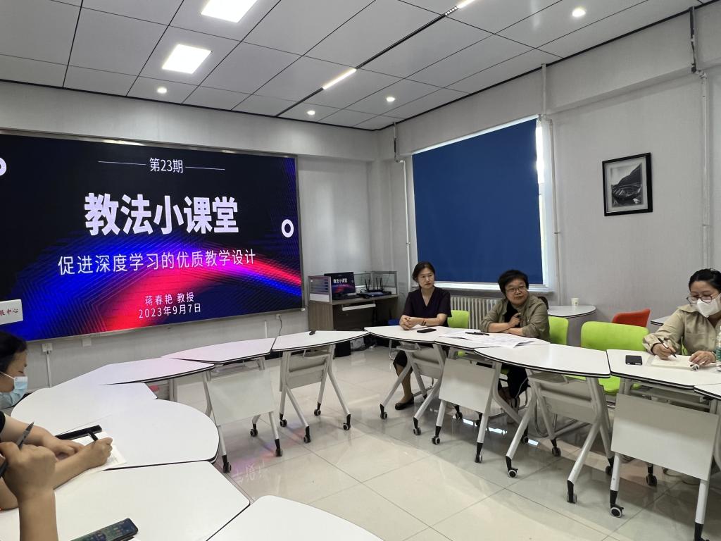 9月7日下午,教师发展中心在2教2102培训室组织了第23期教法小课堂培训交流活动,特邀蒋春艳教授以《促进深度学习的优质教学设计》为题做讲座,来自各教学单位30位教师现场参加了此次培训。