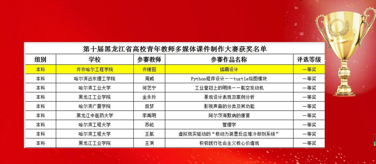 黑龙江省高师培训中心近日公布“第十届黑龙江省高校青年教师多媒体课件制作大赛获奖名单”,本次大赛全省共评选获奖作品73件。其中本科院校组一等奖15件、二等奖25件,高职高专组一等奖11件、二等奖22件。我校信息工程系齐媛园老师荣获本科组一等奖。