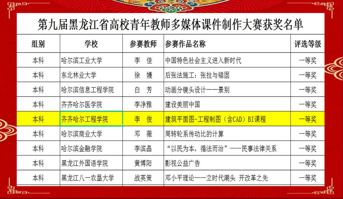 黑龙江省高师培训中心近日公布“第九届黑龙江省高校青年教师多媒体课件制作大赛获奖名单”,我校建筑工程系李俊老师荣获本科组一等奖。