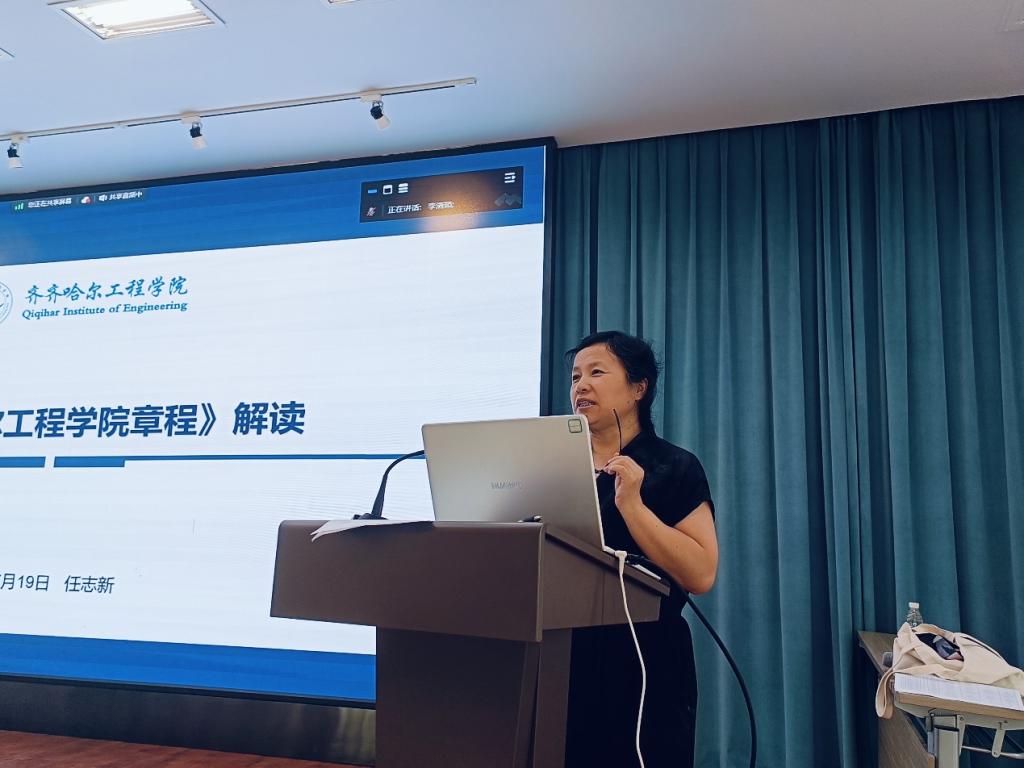 评建办教师任志新作题为《齐齐哈尔工程学院章程解读》的讲座,深入浅出地为新教师解读了齐齐哈尔工程学院的章程建设历史及主要内容。