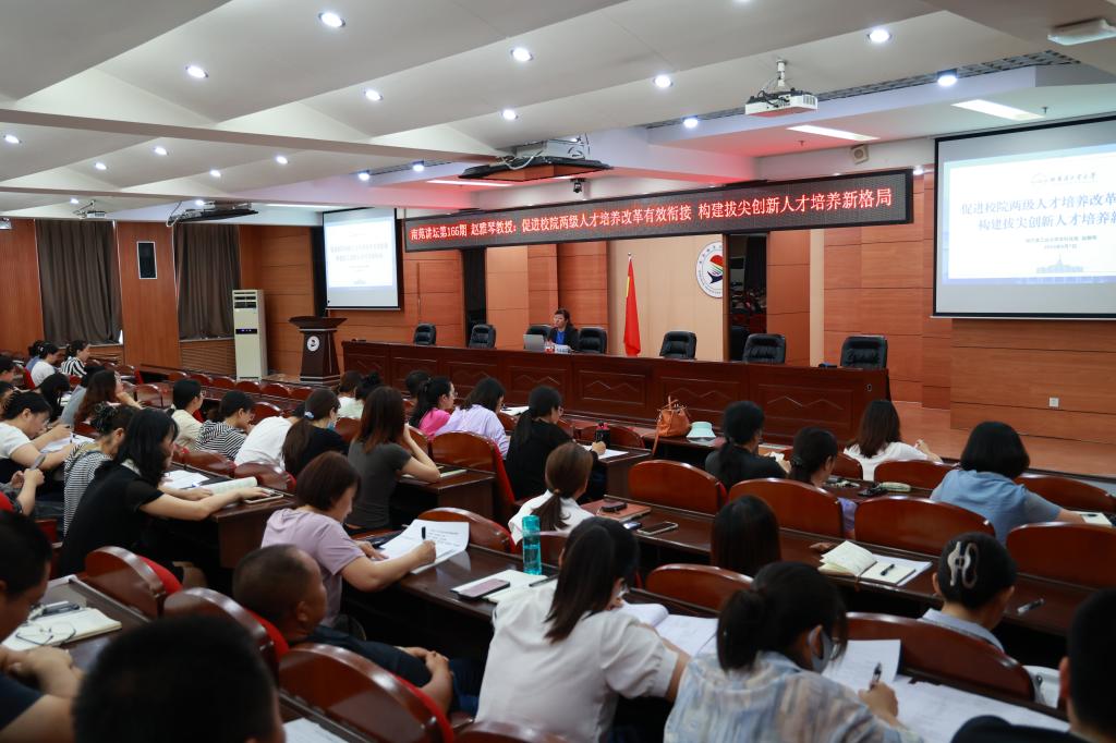 8月7日上午,学校南苑讲坛第166期在图书馆601报告厅举行,哈尔滨工业大学本科生院副院长赵雅琴教授应邀来校作《促进校院两级人才培养改革有效衔接 构建拔尖创新人才培养新格局》讲座。教务处副处长李文禹主持,学校领导、全体干部、教师聆听讲座。